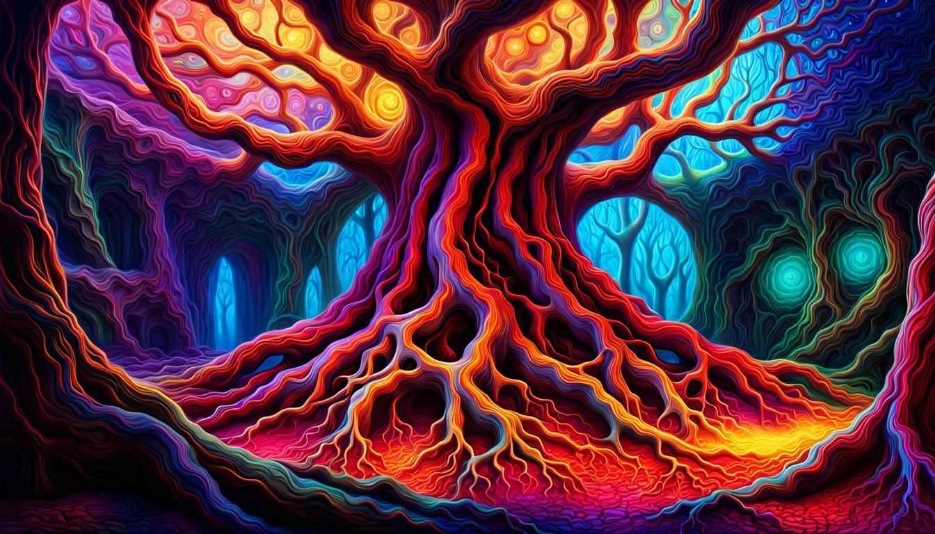 A vibrant ecosystem with a majestic tree, glowing roots, and harmonious wildlife, representing unity...